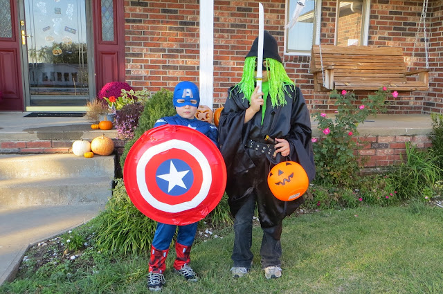 Mr J was a very cool Captain America. Not so sure what Miss E was. She just went through the dress-up box and put on different things--maybe a green haired bandit?